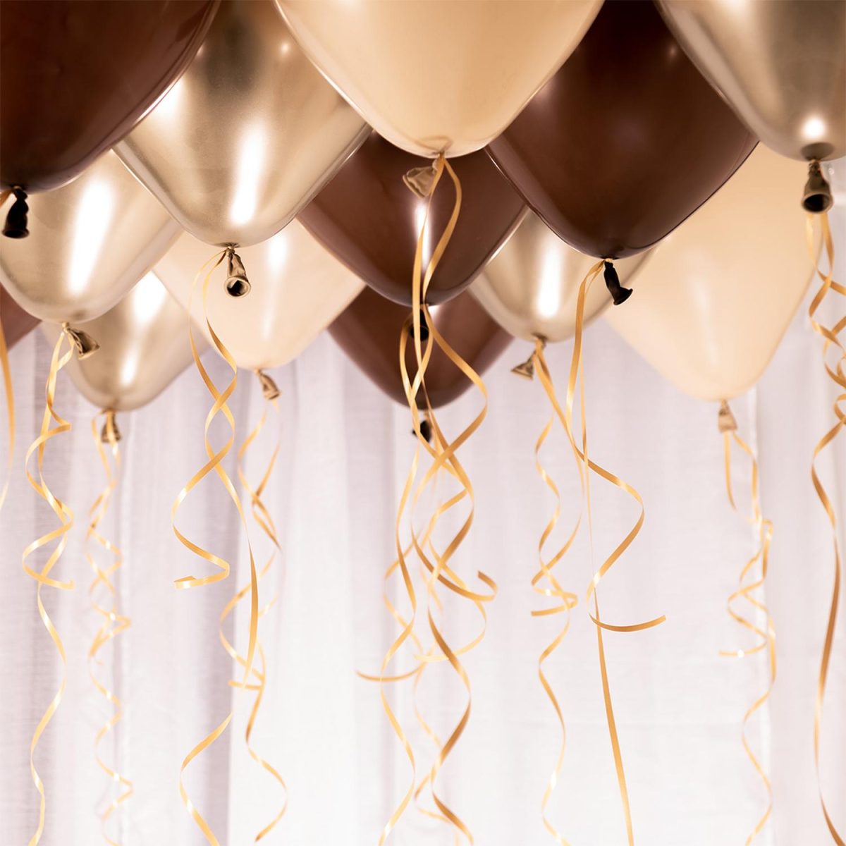Settet inneholder 30 x 33cm ballonger, 60 m kremfarget bånd og en lang remse limdotter som du bruker for å feste ballongene til taket.