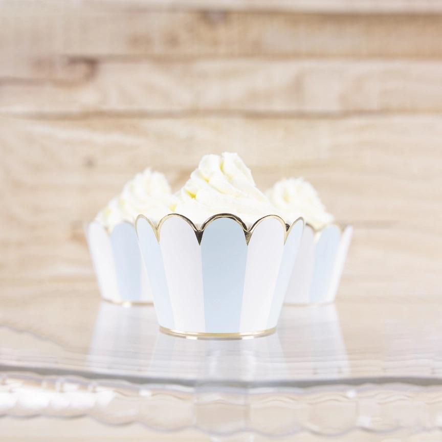 Nydelige muffinsomslag i hvit og dus blå med kant i foliert metallic gull.