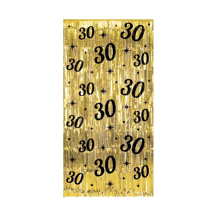 Glittergardin i stilig blank gull med svarte tall og stjerner.