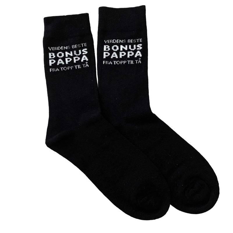 Gavetips til bonuspappa! Morsomme sokker med teksten “Verdens beste bonuspappa fra topp til tå”