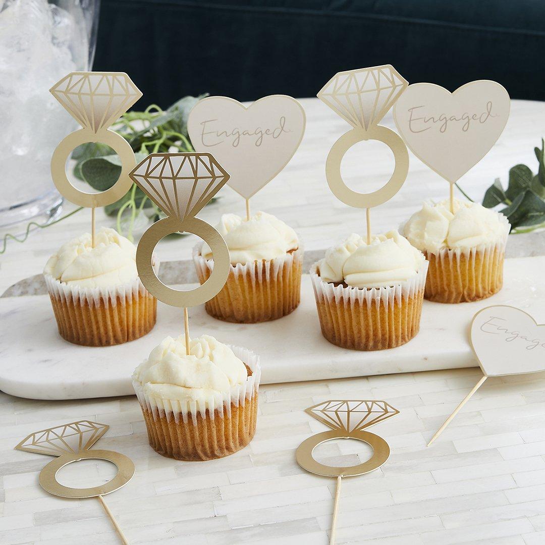 Fin kakepynt med pinner til cupcakes eller annen mat. Halvparten med hjerte med teksten “Engagaged” og halvparten med diamantringer.