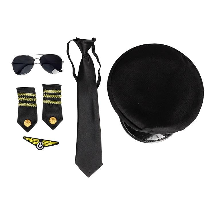 Pakken inneholder hatt, skulderreimer, pilot skilt og solbriller.