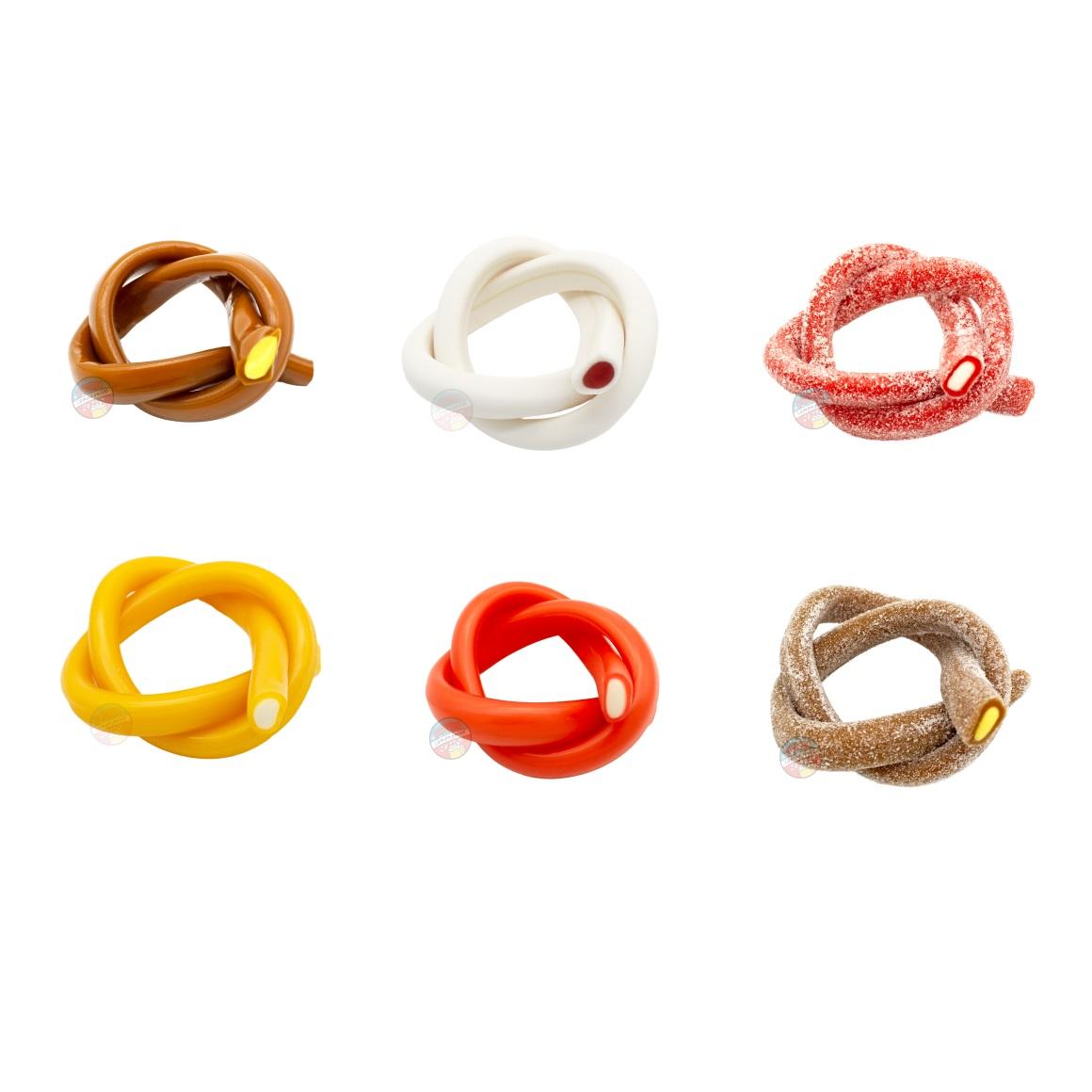Tutti frutti, søt jordbær, sur jordbær, søt cola, sur cola, tropisk mango, sur blåbær, sur bringebær, sur melon, sur tutti frutti, salt lakris, søt lakris, sur eple, søt melon.