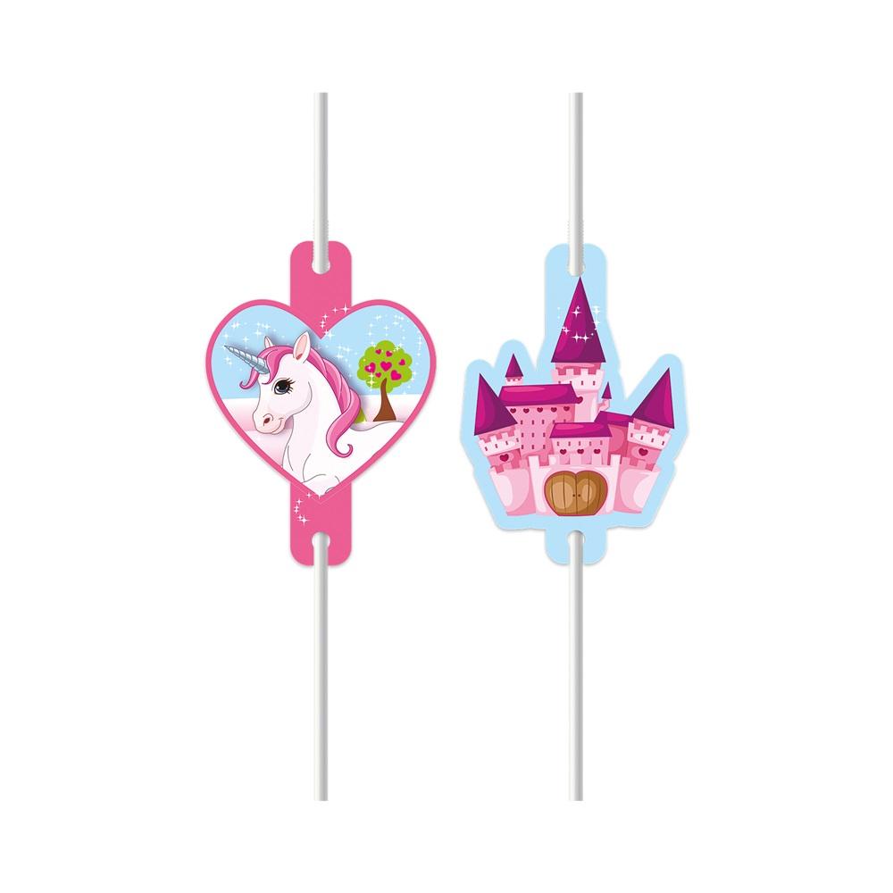 Flotte papirsugerør med motiv av enhjørning og slott.