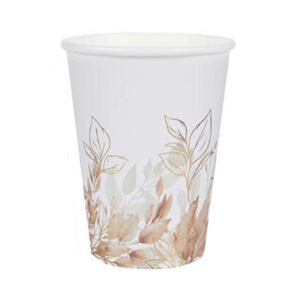 Flotte pappkopper dekorert med blader i naturlige farger.