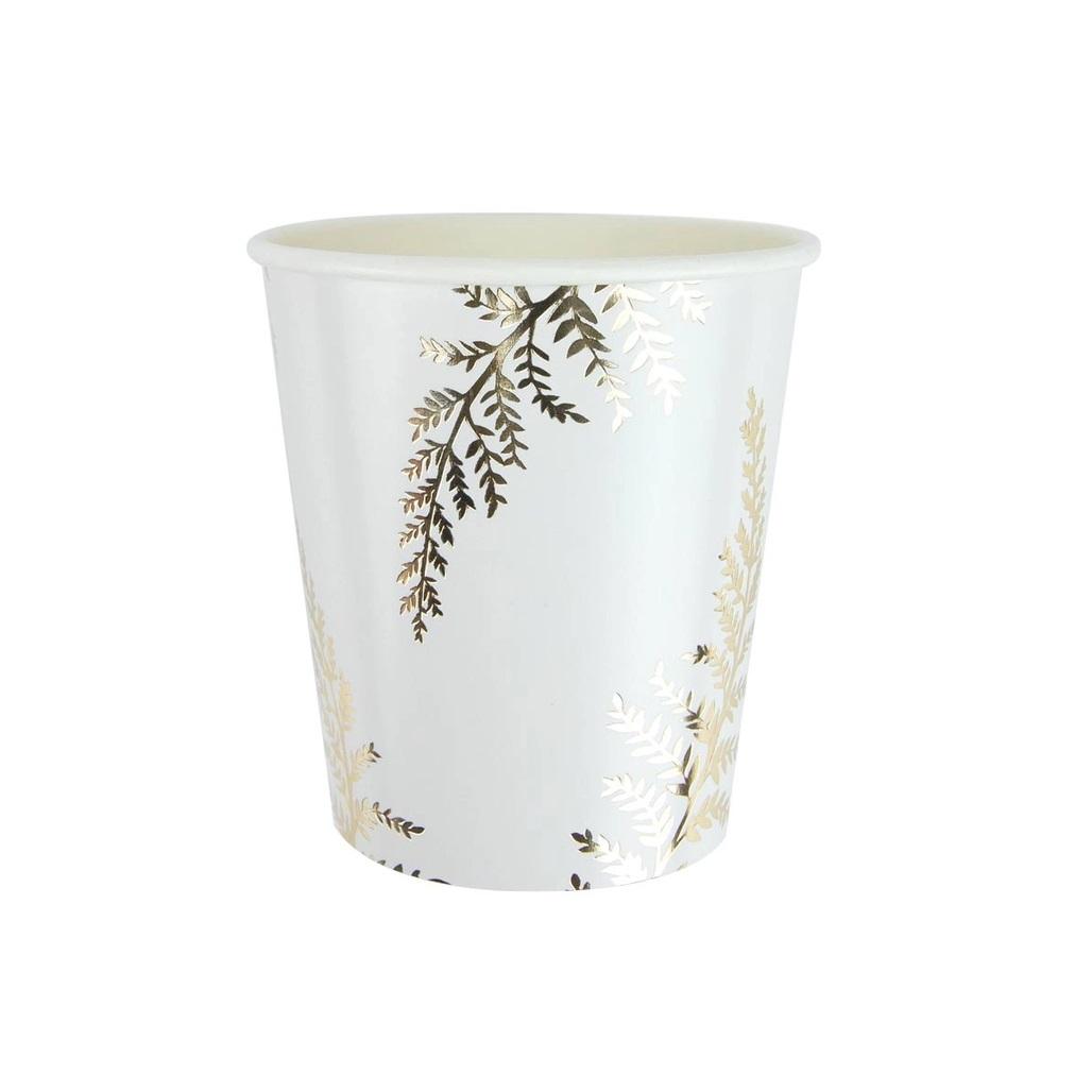 Nydelige eksklusive pappkopper med foliert gull på hvit bakgrunn.