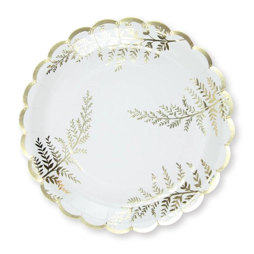 Papptallerkener, hvit med gullbregner – 8 stk