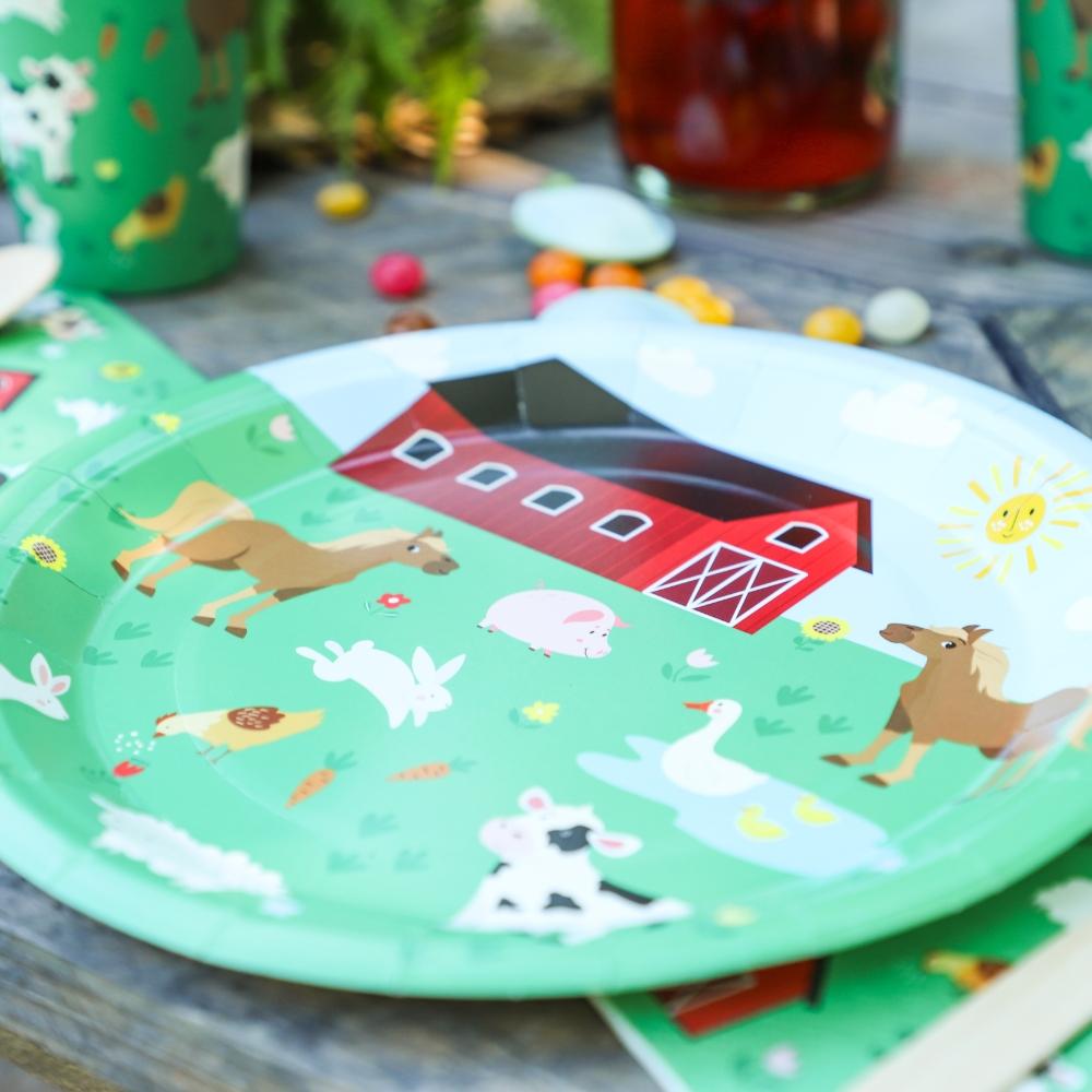 Flotte papptallerkener med bondegårdtema.