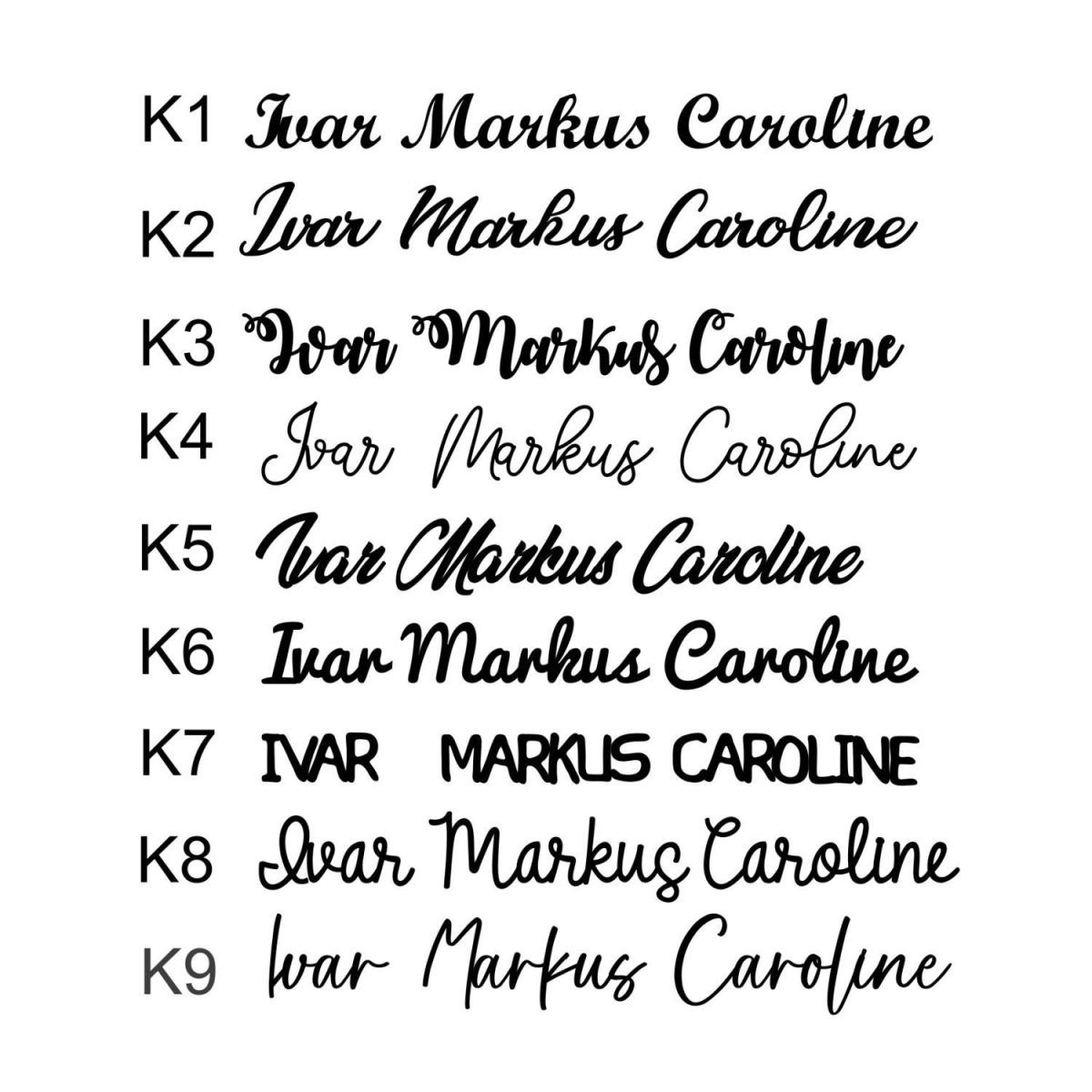 Første bokstav er 15 cm høy. Påfølgende bokstaver vil være lavere avhengig av hvilken skrifttype du velger. Prisen er kalkulert per ord/navn.